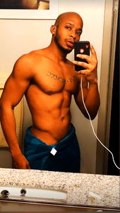 This is a photo of a man with tattoos taking a mirror selfie. He's shirtless and appears to be in a bathroom or similar space. The man is flexing his muscles, showcasing a fit physique. He has a bald head and is holding up one hand to his head in a thoughtful pose.