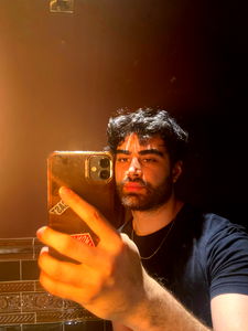 A young man in a bathroom mirror holding a phone with beard and mustache, 19 years old. OnlyFans model.