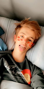 A morning snapshot of the popular OnlyFans model, Aaron. He's in a cozy state with some playful red heart stickers on his face.