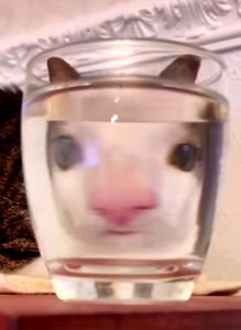 This is an image featuring a cat peeking through the nearly clear glass of water. The cat's eyes and nose are visible, giving a cute and intriguing perspective. It appears to be looking directly at the camera or at someone behind it. The background is blurred but suggests an indoor setting.