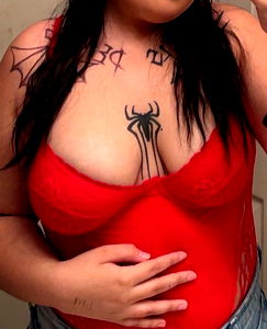 A stunning OnlyFans model with vibrant tattoos, sporting red lingerie and striking black piercings. From Maryland.
