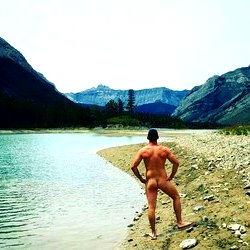 A professional photoshoot with the OnlyFans model 'Joe' striking a pose on the bank of a lake surrounded by majestic mountain scenery. This image showcases a serene and scenic outdoor setting, emphasizing the model's physique while enjoying nature.