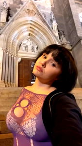 This image features an OnlyFans model, identified by the hashtag # FR33 4DR1. She is standing in front of an impressive stone building, which appears to be a church or cathedral, as suggested by its Gothic architectural style and religious symbols. The woman has short dark hair and is wearing makeup, including black eyeliner. Her attire consists of a purple top with what seems to be a lace or embroidered detail on the left side. She also has a visible tattoo or marking on her right arm. The woman is holding her phone in front of her, likely capturing this moment. The overall atmosphere of the image is casual and social, indicative of modern photography styles often found on social media platforms.