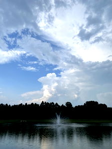The image captures a serene moment at a lake under a dramatic sky, with the sun trying to peek through the clouds. The tranquil water reflects the gray and cloudy sky, creating a peaceful contrast between nature's calmness and its powerful potential.