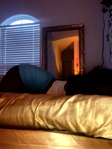 This is a captivating image of the OnlyFans model Aja, who hails from New Orleans. She is captured in a moment of relaxation, lounging on a bed in her favorite blue lingerie. Her eyes are closed, suggesting she might be dreaming or simply enjoying some downtime after a long day. The room around her is softly lit, adding an air of intimacy to the scene.