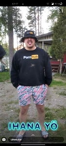 A candid moment of influencer Aku Himanen captured in an OnlyFans model photo, showcasing a casual style with a touch of humor.
