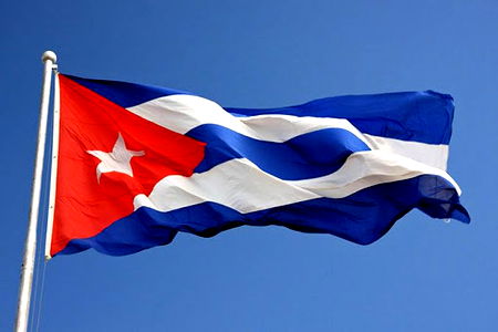 The image shows the Cuban flag, featuring a white star and stripes, fluttering in front of blue and white flags. The Cuban flag is hoisted atop a pole against a clear sky, symbolizing Cuba's presence in this location.
