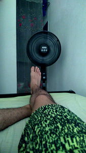 An image featuring a man's leg wearing shorts with various patterns in shades of green, yellow, and red, accompanied by a black fan in the background. The photo has an artistic and lively vibe.