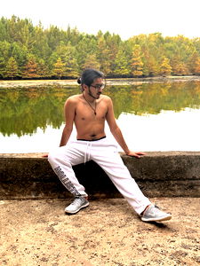 Model and actor posing in front of lake, shirtless, standing near water. Wearing a necklace and shorts, displaying his physique.