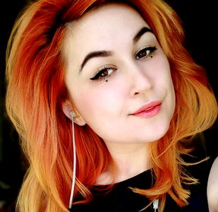 A young, vibrant woman with striking red hair, sporting a casual yet chic style. She has headphones around her neck, suggesting an affinity for music or podcasts.