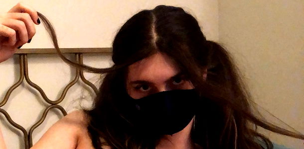 Onlyfans model Ally is seen in this image, exuding a casual yet stylish vibe. She sports a black face mask and a matching black hair tie. Her pose with one hand on her hip and the other raised to her head adds an air of confidence and style. The backdrop is minimalistic with a plain white wall, which helps Ally stand out even more.