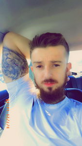 A stylish man leans against a car, showcasing his tattoos and beard. He sports a casual look in a selfie shot from the side of the car. His tattoos add a unique touch to his appearance.