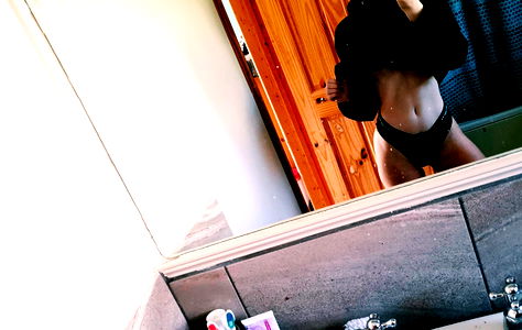 Candid moment of model Alicee, capturing her in a bathroom mirror. She is showcasing a full-body shot with a mirror selfie.