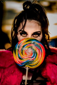 Alys Belyn, an OnlyFans model from Phoenix, is seen holding a rainbow-colored lollipop. She's dressed in vibrant attire with feathers, adding to the playful atmosphere of the image.