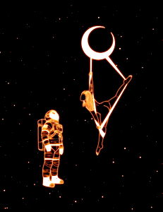Stunning model Alyson Monroe showcases a shimmering sequin body suit with an open back, paired with a revealing halter top and thigh high boots. The metallic outfit highlights her long hair and athletic physique.
