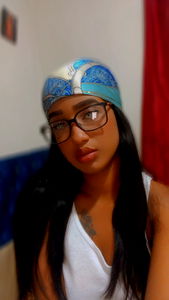 A young adult woman with long hair, wearing glasses, a bandana, and a white sleeveless top. She is seated indoors with a red backdrop. She is looking directly at the camera with a slight smile.