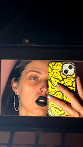 A glamorous and stylish OnlyFans model at an event, capturing her moment on a phone. She sports a bold makeup look with a matching outfit.