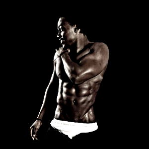 A fit and muscular man in a black and white photo. He is shirtless, showcasing his athletic physique, with one hand on his hip and the other resting by his side.