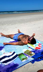 A young man relaxing on a towel, enjoying the sun and sand. Age: 25 years.