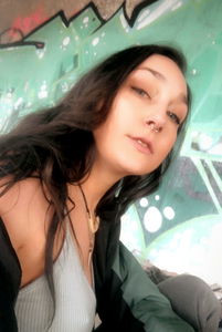 The model Ambrosia is seen posing against a graffiti-covered wall, with her long hair and expressive gaze. Her casual attire contrasts with the urban backdrop.