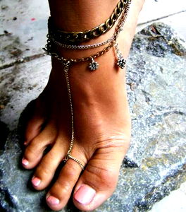 In this image, AmberFoots is seen showcasing a unique style of foot adornment with a jewelry chain. The silver anklet adds a touch of elegance to the ensemble, while the toe ring lends a personalized touch. The model's choice of footwear complements the overall look, creating a chic and stylish vibe.