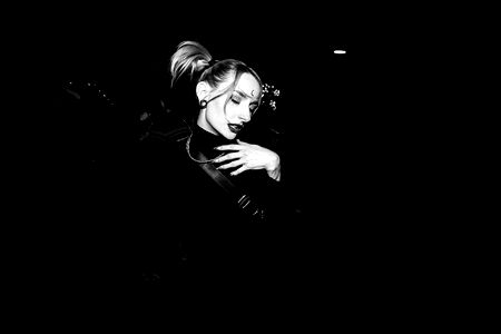 Beautiful and tattooed model Amelie Russel from Ukraine. Striking a pose with her long hair, vibrant makeup, and unique style. The image showcases her as an Onlyfans model, and she exudes confidence and allure.