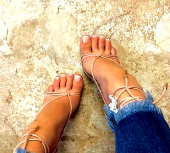 Arimori, a model on OnlyFans, poses with her foot in a black fishnet stocking. She's wearing white nails and is captured from a side angle.
