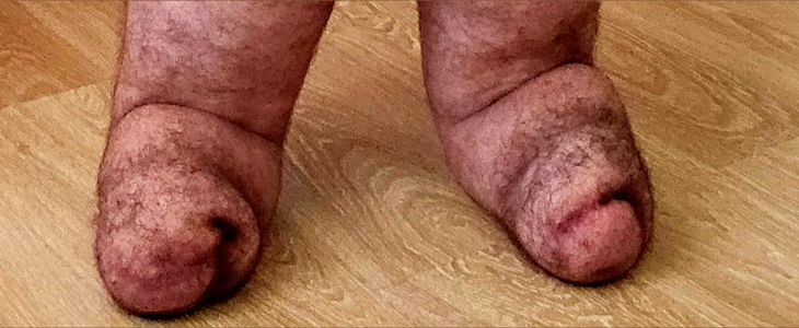 The image shows a leg with an amputation, with the knee area being stitched. The person is wearing a sleeveless top and shorts, and there appears to be a tattoo on the arm. The background suggests an indoor setting, possibly a room in a home.