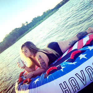 This image is a promotional photo of an OnlyFans model named Amy. She is wearing a black speedo and has her foot up on the boat. The background shows a picturesque sunset on a lake, suggesting that she might be offering nude content or personal experiences to her fans. Please note that the actual content of her OnlyFans account may not be suitable for all audiences.