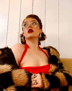 Amidst a white backdrop, the model exudes a vintage vibe with her red dress and fur coat. Her chic accessory is the statement-making glasses that add an intellectual touch to her look.