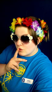 The image is of a person dressed in cosplay makeup and an orange wig. The individual is making a pose with their hands on either side of their face, giving the impression of a playful or goofy expression. They are wearing a white t-shirt with what appears to be some text or graphic on it, which is partially visible due to the angle of the photo. The background is indistinct but suggests an indoor setting.