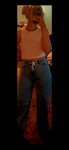 Model AN2022 from Wisconsin demonstrates a stylish and trendy ensemble featuring high-waisted flared jeans, cropped tank top, and sneakers. Perfect for a casual yet fashionable outing.