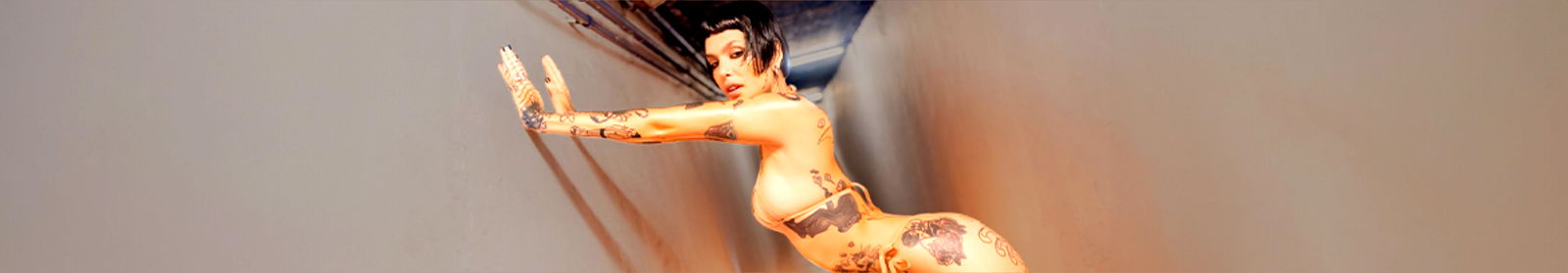This image features a model in an OnlyFans-themed pose. The model is wearing tattoos, a bikini, and has distinctive hair with a colorful design. They are showcasing their style and body art, which are prominent in the photo. The background suggests an indoor setting with lighting that emphasizes the model's appearance.