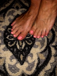 Anastasia Gia showcases her neatly painted toenails. Chicago model Anastasia Gia is known for her fashionable nail art and beauty tips. In the image, she is captured in a moment of relaxation with her feet propped up on a patterned surface.