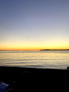 A serene evening at the shore, with hues of orange and pink reflecting on the calm waters. The sky is painted in soft shades of light blue, as the sun begins to set over the horizon.