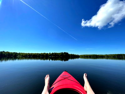 A woman takes a break from paddling her red kayak, floating on the tranquil water with a scenic background.