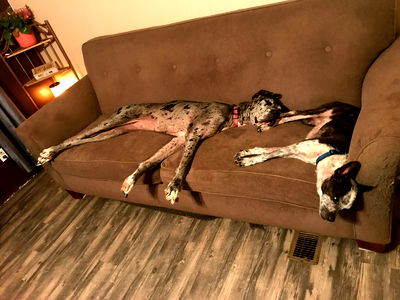 A cozy scene of two dogs sprawled out comfortably on a beige couch, with one dog looking directly at the camera. The room has a neutral color palette and a casual atmosphere.