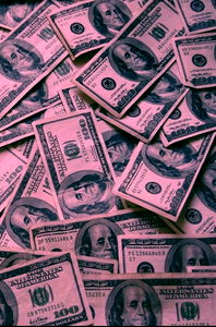 A staged photograph featuring several banknotes, predominantly in the denomination of one hundred dollars, arranged around an image of George Washington on a twenty-dollar bill. The bills are spread out on a surface and appear to be new and in good condition.