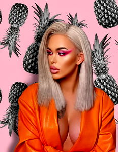 Andrea Bianchi, a model known for her work on OnlyFans, is captured in this promotional image. She is seen wearing a vibrant orange jumpsuit with blonde hair and a striking blue eye shadow. The background features a playful pineapple pattern. Age: 25, Gender: Female