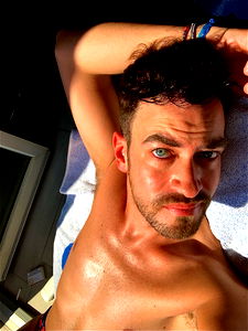 This is Blue_eyes86, a model from Italy. He is taking a selfie with his phone while standing in front of an old castle. He is dressed casually in a white t-shirt and dark jeans. In the background, you can see people enjoying their day out near the water. The historic building adds a touch of grandeur to the scene.