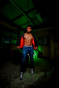 An OnlyFans model posing confidently in a warehouse with a baseball bat. He is shirtless and wearing blue jeans. The background features construction materials, and the lighting is moody with greenish tones. His pose and attire suggest a strong, athletic persona.