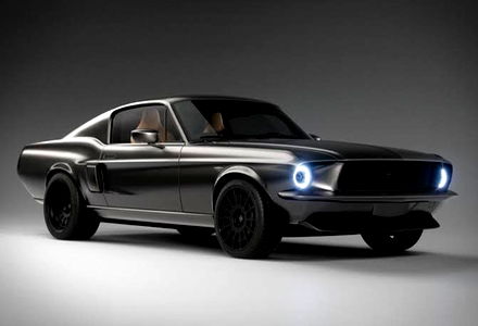 This is an image of a silver Ford Mustang. It features a black stripe and has customizations including a large air intake in the hood and a roll bar inside. The car is parked in a studio with a plain background, and there's a model car nearby.