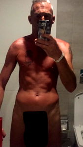 An adult model from Newcastle Upon Tyne, England, showcasing his physique in a bathroom mirror. He is shirtless and wearing only a red bracelet.