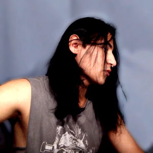 A young adult rock musician, caught in a moment of celebration or frustration with a peace sign. He is holding up his hand to show the gesture. Andru's expression conveys emotion and energy.
