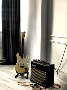 A serene and organized room where Andrะน ะะพะฒะบ, a talented guitarist, enjoys his hobbies. The space is filled with musical instruments, indicating the passion of its owner for music. A guitar stands ready for play, while an amplifier waits to amplify the melodies created in this haven.
