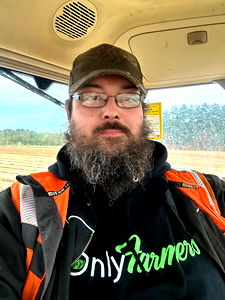 This is an image featuring a man wearing a cap, sunglasses, and a beard. He is sitting inside a tractor cab with agricultural fields visible through the windows. The man appears to be engaged in farming or farm-related activities. There is no text present in the image.