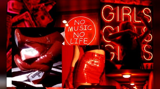 The image captures a model dressed in red lingerie, posing seductively. She's wearing a bra and panties, which are adorned with tattoos, including one visible on her stomach. Her tattoos include what seems to be a spider web design covering most of her torso. The model has multiple piercings that stand out in the photo.