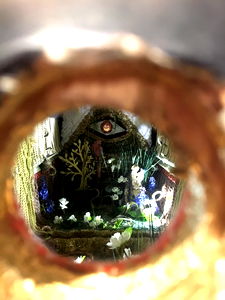 The image showcases a meticulously designed dollhouse-like model named Angel, which is set in the ocean. The room appears to be filled with various elements, including a jellyfish and a fish, all crafted with attention to detail. The perspective of the photo captures this small-scale world through a peephole view, adding an element of curiosity and exploration.