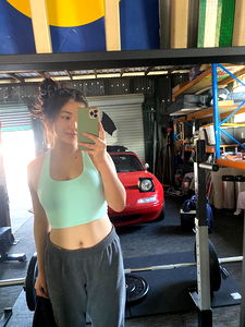 Angel's fitness model showcasing her workout attire in the bathroom. Her dedication to fitness and style is evident in this image. The reflection of a mirror adds depth to the photo.