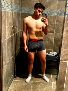 Angel, a young adult, showcases his fit physique with a casual selfie from bed. The image features the model shirtless and lying down with glasses, exuding confidence and comfort. The background is minimalistic, hinting at the serene environment of the bedroom. This image might appeal to those interested in fitness, style, and personal branding.